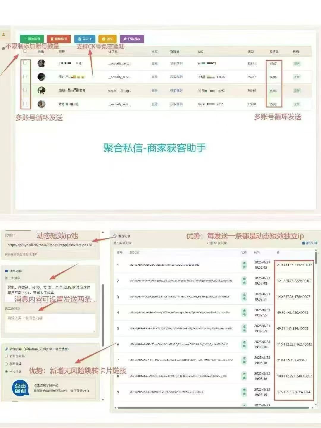 优势2:多账号内动态IP隔离 (每发送一条私信IP地址都会不一样,实时进行账号隔离)